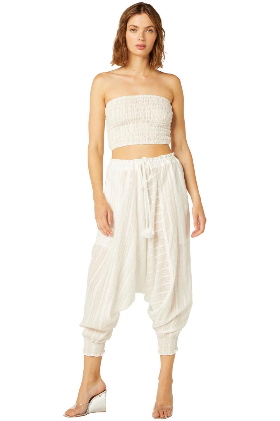 Our newest Kavita pant bring a chic touch to a getaway-ready wardrobe. Handcrafted from a white cotton fabrication with shimmering lurex throughout, these pants feature an elastic waistband with our signature petal ties. These harem-style pants are finished off with deep side pockets and elastic cuffs at the ankles. Complete the look with the coordinating Roksana Bandeau.