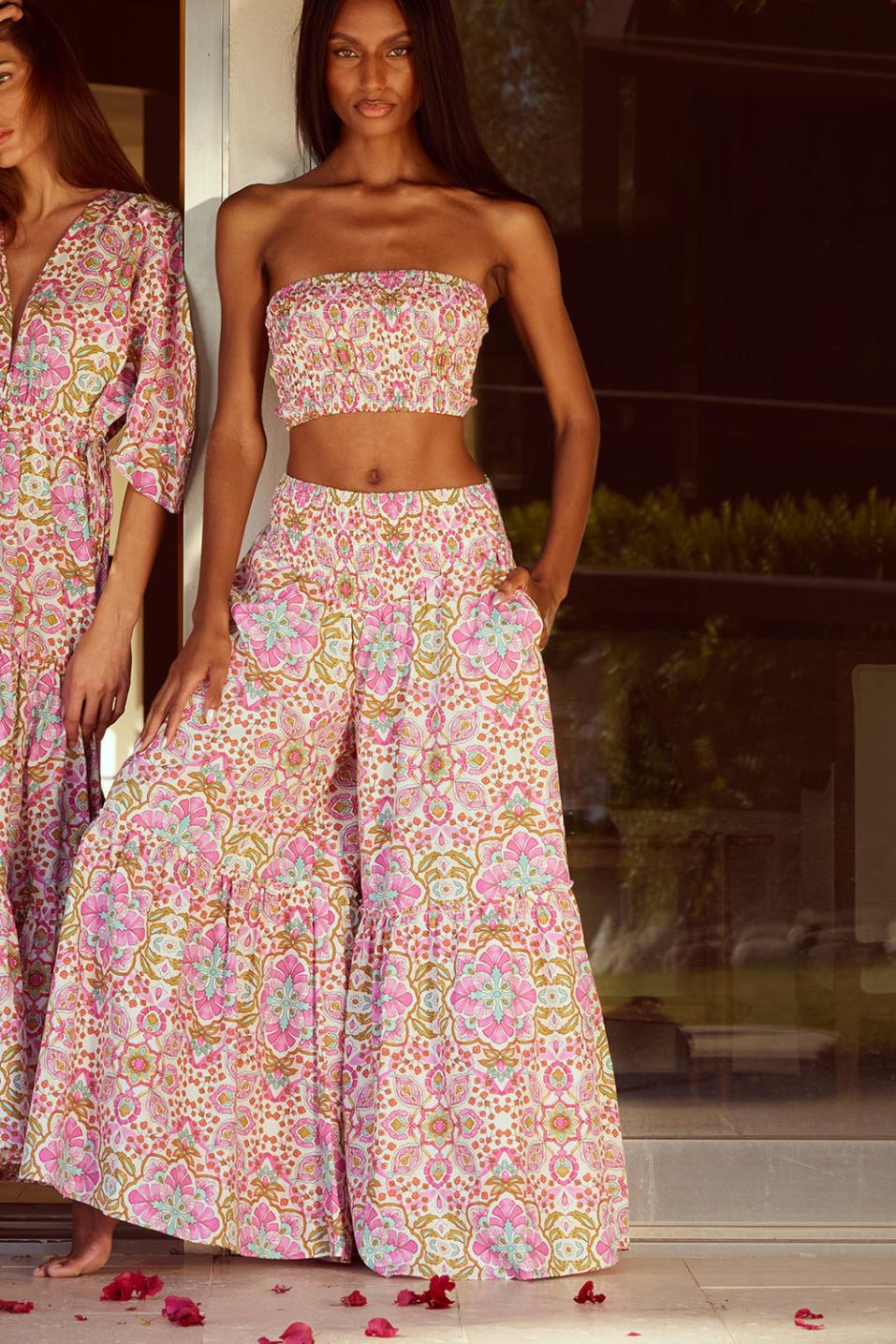 Ziba is a new take on an ultra-wide leg pant style. Cut from a floral print cotton poplin, these pants feature a wide smocked elastic waistband and side-slit pockets leading into ultra-wide pants with ruffle detail. Complete the look with the coordinating Roksana Bandeau.Made in the USA Dry Clean 100% CottonModel Measurements: Height 5’10”, Waist 24.5, Bust 30, Hips 34.5 Model is wearing size XS