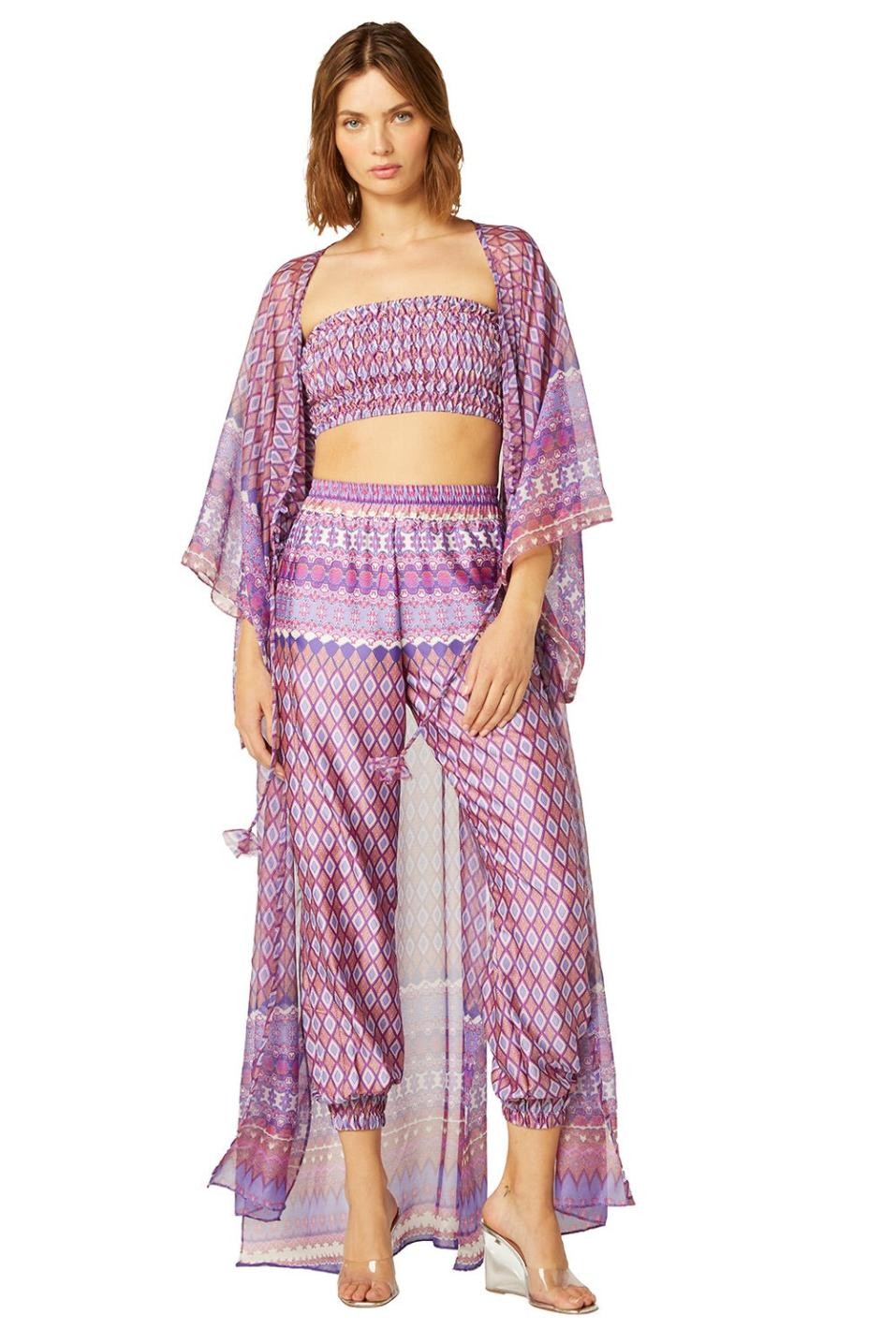 The effortless Veruschka Robe is a getaway-ready essential handcrafted from our delicate chiffon. Featuring a gorgeous violet geo print and sheer kimono sleeves. An adjustable petal tie waist leads into a flowing skirt with side slits. This self-covered button front style can be paired with everything from your favorite swimwear to our Roksana Bandeau and Noomi Pant for an elevated look.Made in the USA Dry Clean 100% Poly ChiffonModel Measurements: Height 5'9", Waist 23, Bust 32, Hips 34.5 Model is wearing size XS