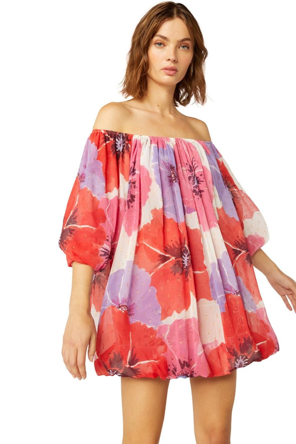 An effortless new off-the-shoulder silhouette cut from a vibrant poppy print chiffon with shimmering lurex throughout. Three-quarter, off-the-shoulder puff sleeves lead into a mini bubble hemline. The smocked elastic neckline allows for a comfortable fit. This feminine style is an easy addition to your wardrobe.Made in the USA Dry Clean 97% Polyester 3% MetallicModel Measurements: Height 5'9", Waist 23, Bust 32, Hips 34.5 Model is wearing size XS