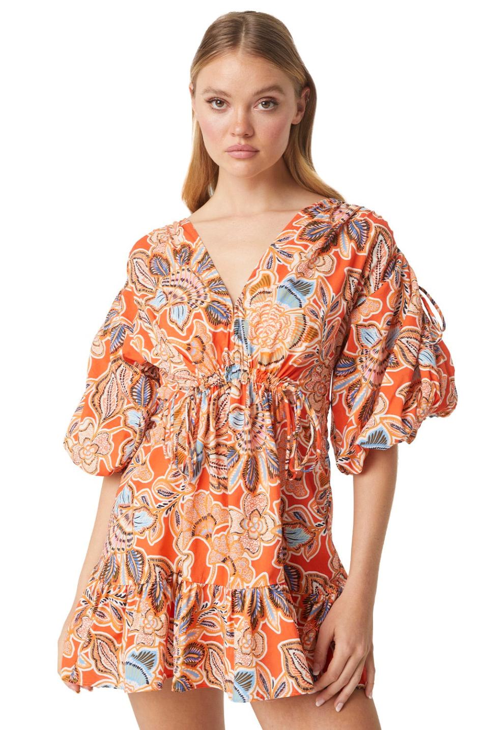 A new take on a flattering mini silhouette. Handcrafted from a vibrant floral printed cotton, this mini dress includes dramatic puffed sleeves with adjustable shoulder ties and a deep v-neckline with hook-and-eye closure. Self-ties on each side of the waist allows the bodice to be adjusted for freedom of styling.Made in MoroccoDry Clean100% CottonModel Measurements: Height 5’8”, Waist 24, Bust 33, Hips 35.5Model is wearing size XS