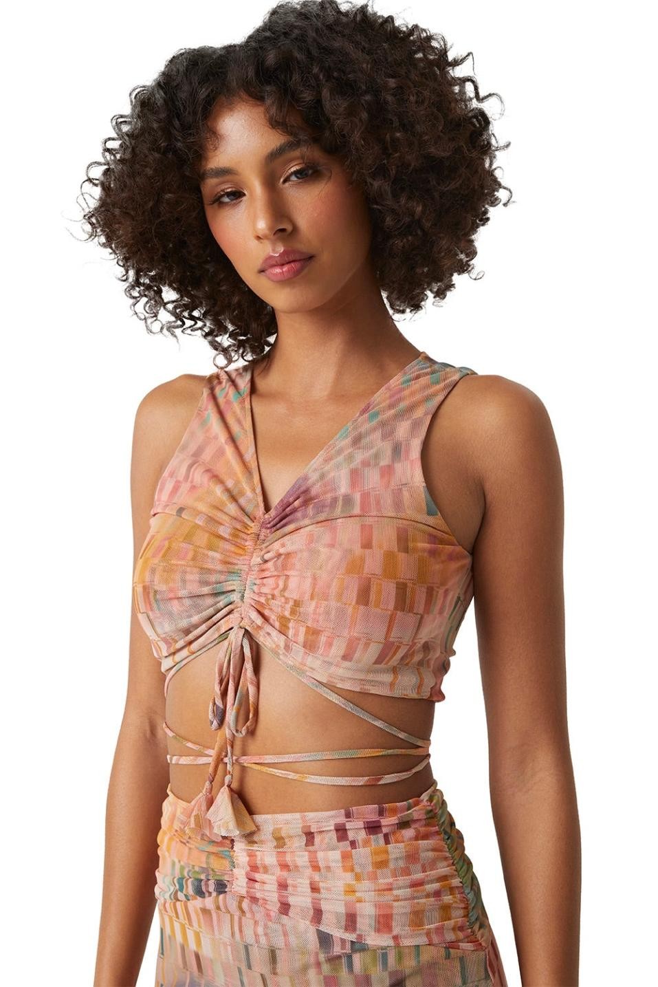 Il top Froma è un modello che valorizza la figura, realizzato in rete stampata Disco Matrix. Questo top corto senza maniche presenta una scollatura a V che si apre su un corpetto arricciato con lacci regolabili per una maggiore libertà di stile. Abbinalo alla gonna coordinata Bruna per uno stile perfetto per la stagione calda. Prodotto in Italia. Lavaggio a secco. 98% poliestere, 2% elastan. Misure della modella: altezza 178 cm, vita 62 cm, petto 8 cm, fianchi 9 cm. La modella indossa una taglia XS.