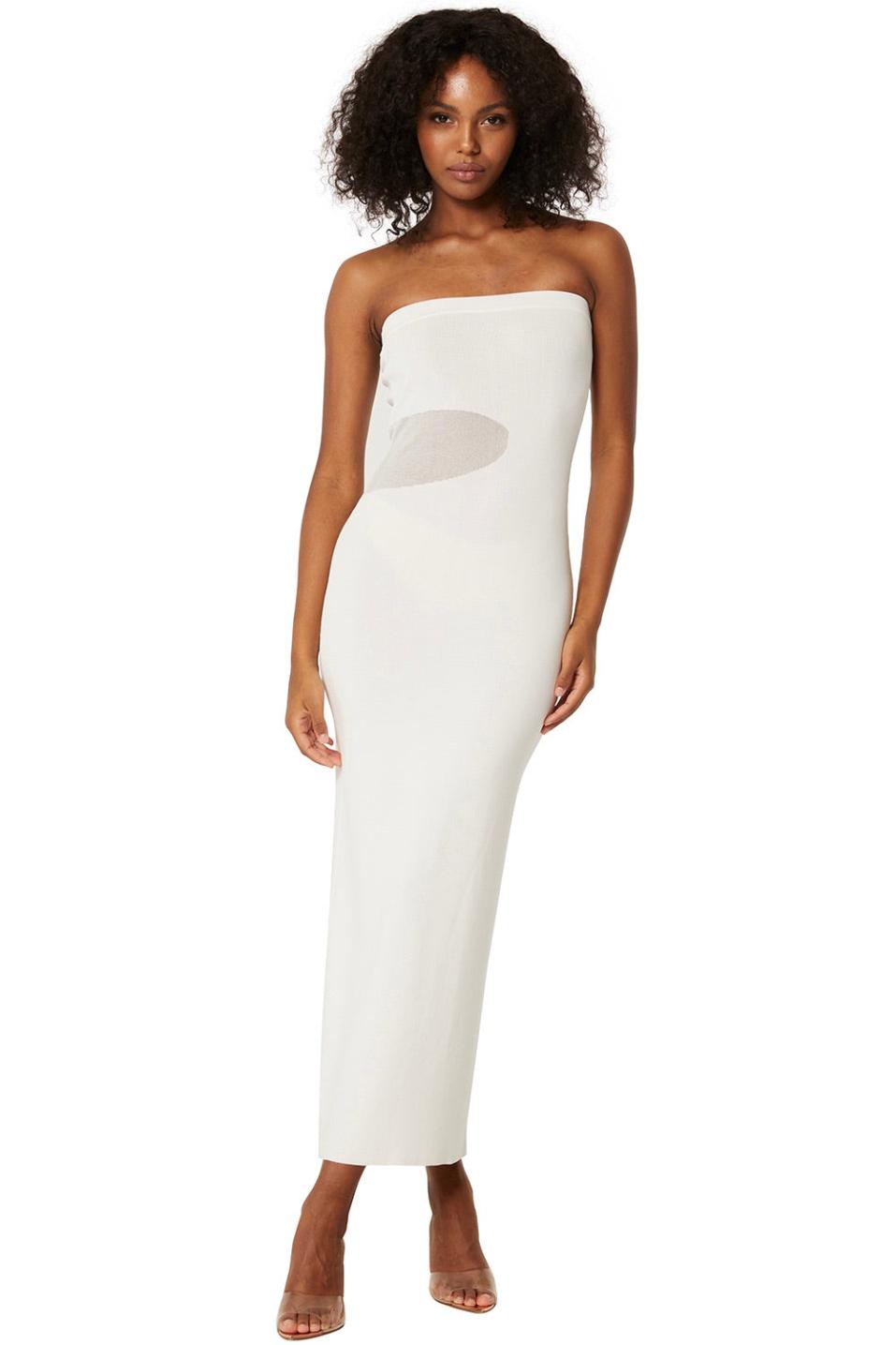 Our new Dua is the perfect warm-weather takeaway piece to transition from day to night. This figure flattering, strapless midi is accented by a semi-sheer cutout detail at the bodice with just the right amount of shimmer.Made in the USA Dry Clean65% Viscose, 35% NylonModel Measurements: Height 5'9", Waist 23, Bust 32, Hips 34.5Model is wearing size XS