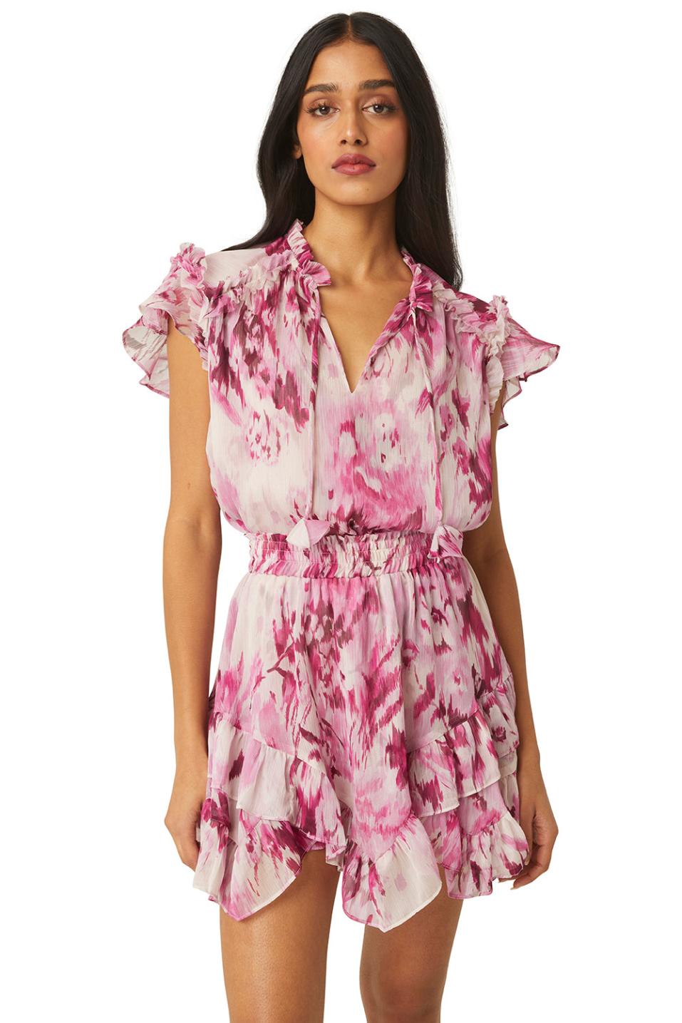 Handcrafted from airy chiffon, our new Elah skirt is accented with an asymmetric, ruffle-trimmed hem and invigorated with a rose print chiffon. Featuring an elastic waistband and a double-lined skirt, this fresh piece makes for a perfect partner to the coordinating Manu top.Made in the USA Dry Clean 100% Poly ChiffonModel Measurements: Height 5'9", Waist 21.5, Bust 30.5, Hips 34.5 Model is wearing size XS