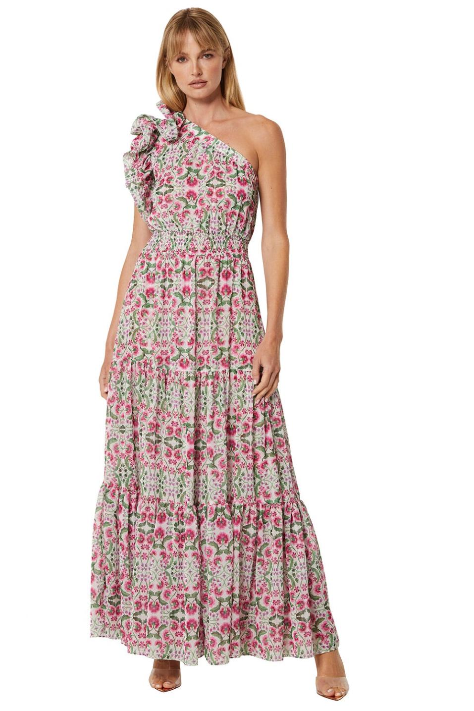 Our new Ilaria is a romantic maxi silhouette handcrafted from a floral chiffon. Defined by a dramatic sculptural one-shoulder ruffle, a comfortable smocked elastic waist drapes into a double-lined wide ruffle maxi skirt. Pair this standout style with heels and a chic clutch for the perfect best-dressed guest look. Made in the USA Dry Clean 100% Poly ChiffonModel Measurements: Height 5'9", Waist 23, Bust 32, Hips 34.5 Model is wearing size XS