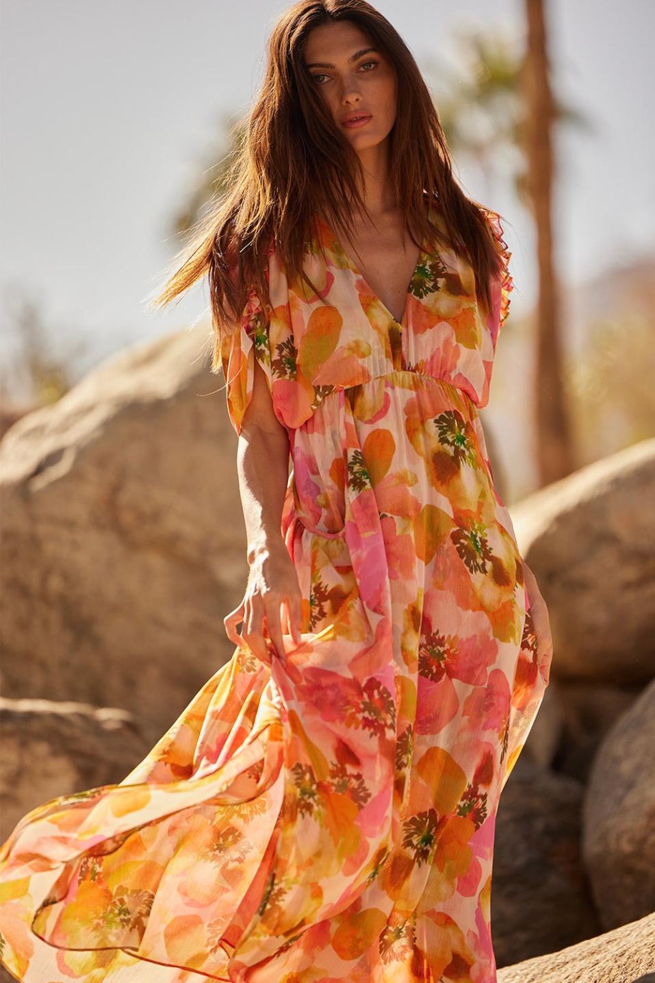 Our newest Isabel is an effortless midi silhouette handcrafted from a vibrant floral print chiffon. A deep v-neckline is complete with hook-and-eye closure leading into an empire waist. Wide sleeves feature ruched, ruffle-detailed shoulders while the skirt features side pockets with piping detail. Pair with sandals for the perfect addition to your daytime wardrobe.Made in the USA Dry Clean100% Poly ChiffonModel Measurements: Height 5’10”, Waist 24.5, Bust 30, Hips 34.5Model is wearing size XS