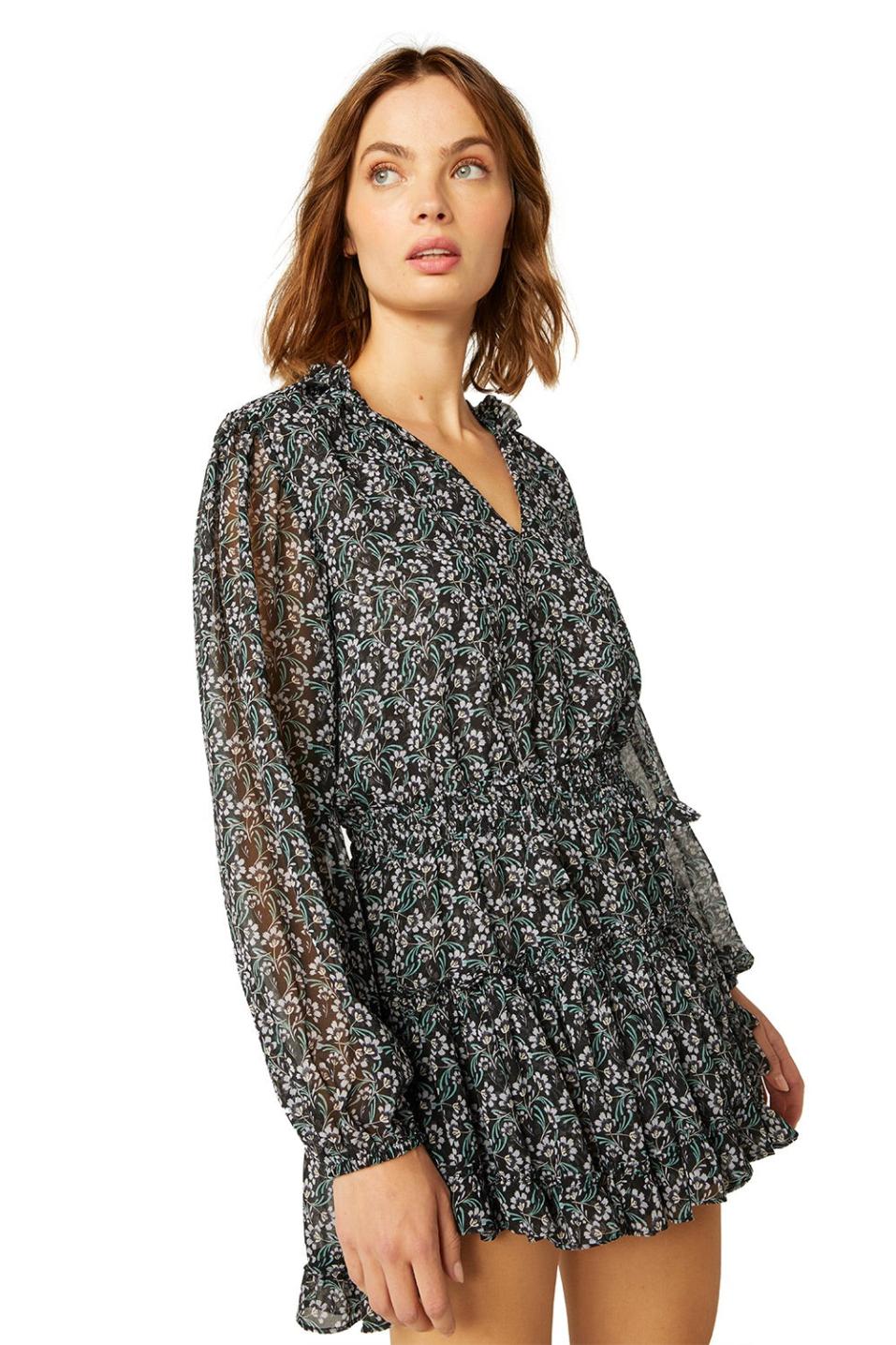 This style is a MISA exclusive.A classic style handcrafted from an effortless floral print chiffon. Featuring a split neck opening with our signature petal string ties, this playful long sleeve mini dress is double-lined throughout with an elastic waist and a tiered skirt.Made in MoroccoDry Clean100% Poly ChiffonModel Measurements: Height 5'9", Waist 23, Bust 32, Hips 34.5Model is wearing size XS