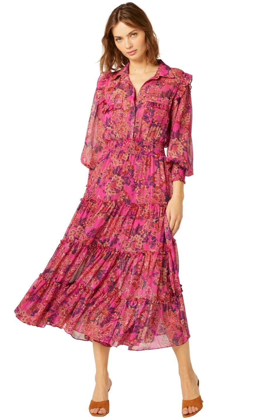 A chic update on our classic button shirt maxi dress. Rendered in a gorgeous fuchsia batik chiffon fabrication with shimmering lurex throughout, this sophisticated style features a semi-sheer bodice with ruffle-trimmed chest pockets leading into a shirred elastic waist. A sweet ruffle detail at the shoulders compliments the ruffle-trimmed double-lined tiered maxi skirt. Semi-sheer long sleeves are finished off with a shirred cuff.Made in the USA Dry Clean 97% Polyester 3% MetallicModel Measurements: Height 5'9", Waist 23, Bust 32, Hips 34.5 Model is wearing size XS