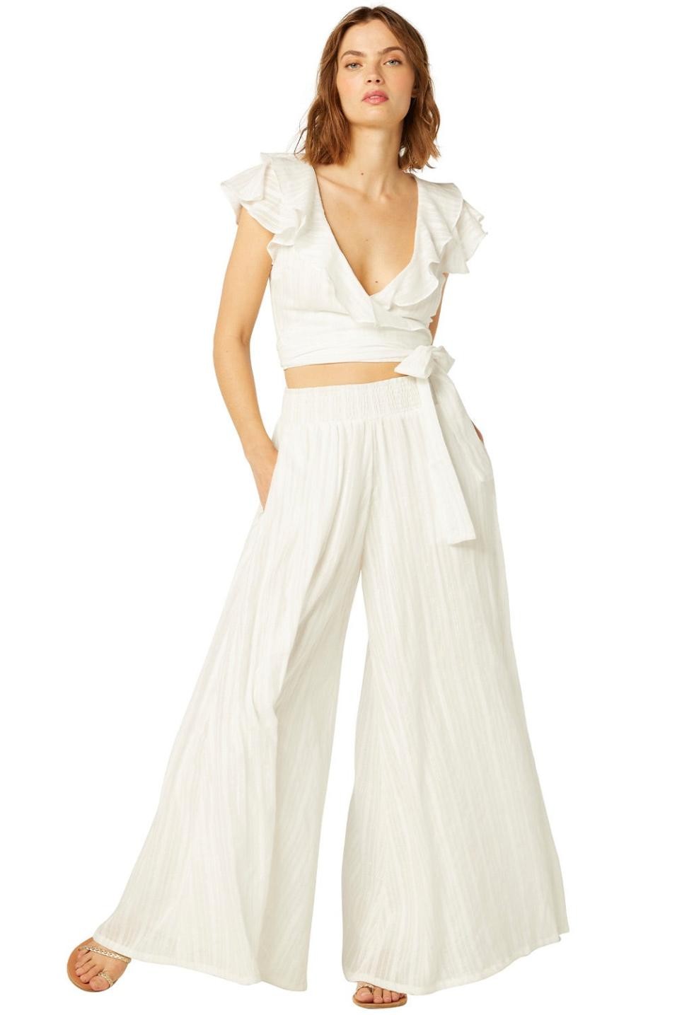 Pilar is a new take on a classic wide-leg pant style. Cut from a white cotton with shimmering lurex, these pants feature a comfortable elastic waistband, side-slit pockets and wide legs. Complete the look with the coordinating Marah Top or Roksana Bandeau.Made in the USA Dry Clean 100% CottonModel Measurements: Height 5'9", Waist 23, Bust 32, Hips 34.5 Model is wearing size XS
