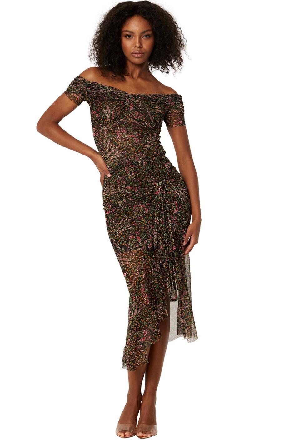 The Ria skirt is a standout silhouette for your next date night. Cut in a floral bouquet printed mesh, this figure-flattering skirt features an asymmetric skirt with side-tie detail that can be adjusted for comfort. Pair with the coordinating Sandy bodysuit for an elevated look.Made in the USA Dry Clean 95% Polyester 5% SpandexModel Measurements: Height 5'9", Waist 23, Bust 32, Hips 34.5 Model is wearing size XS