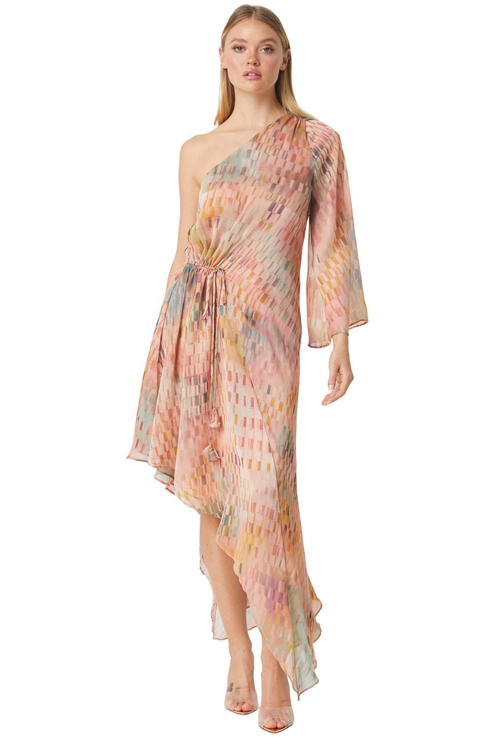 Our newest Rooney is an updated take on a statement dress for your next occasion. Cut in a Disco Matrix print chiffon, this one-shoulder maxi includes a long flutter sleeve, asymmetric hemline and an adjustable ruched waist with petal tie detail for freedom of styling. Pair with heels and your favorite clutch for a best-dressed guest look.Made in the USA Dry Clean 100% Poly ChiffonModel Measurements: Height 5’8”, Waist 24, Bust 33, Hips 35.5 Model is wearing size XS
