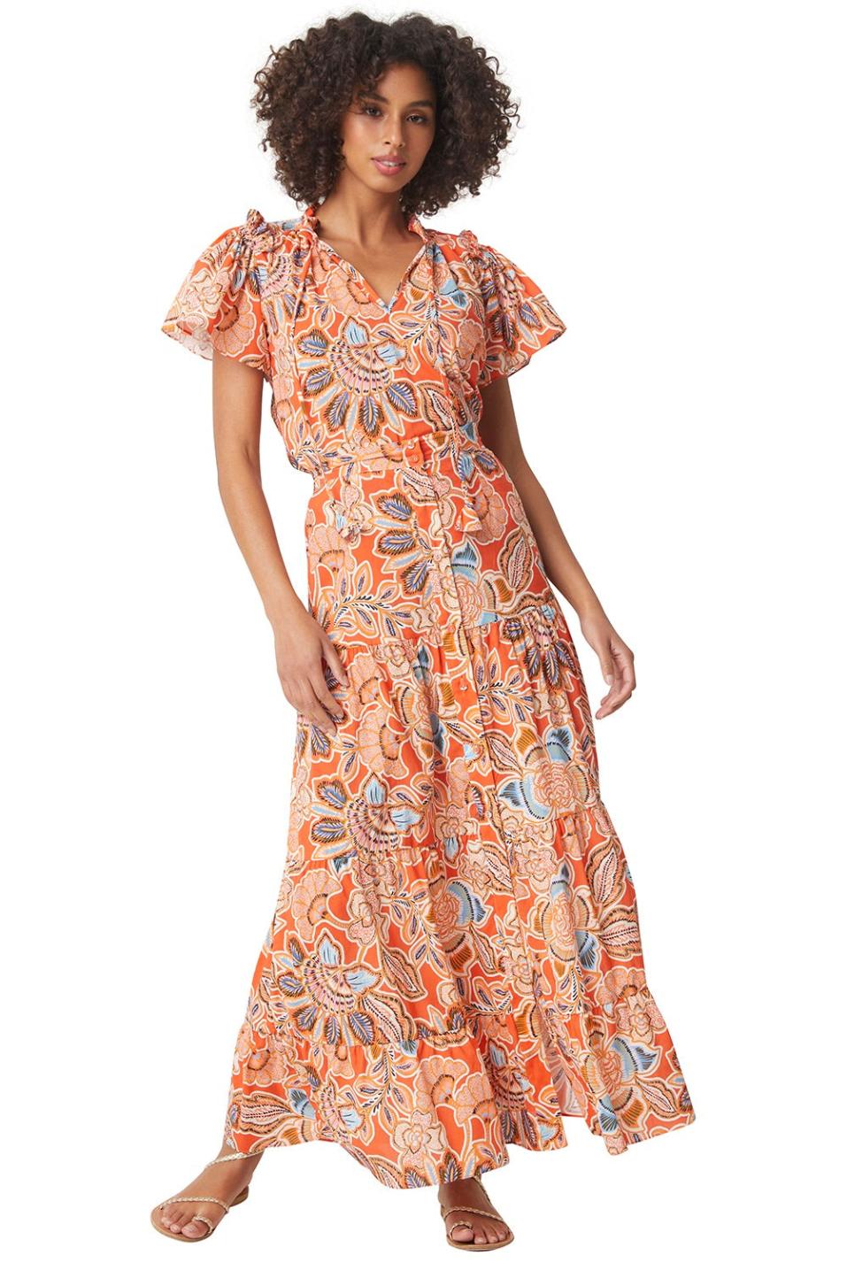 Roopal is a breezy new take on our classic maxi skirt silhouette. Cut from a vibrant floral cotton, this tiered silhouette features a partially elastic waistband leading into a covered button front skirt. Pair with the coordinating Suparna top for a coordinated look.Made in MoroccoDry Clean100% CottonModel Measurements: Height 5’10”, Waist 24.5, Bust 30, Hips 34.5Model is wearing size XS