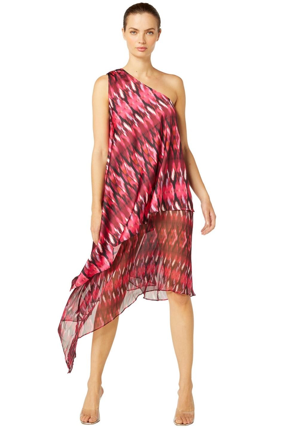 Our new Yasmin dress is a standout silhouette cut from layers of fuchsia ikat printed satin and semi-sheer chiffon. This one-shoulder trapeze style dress is complete with an asymmetric skirt. Pair this standout style with heels and a chic clutch for the perfect best-dressed guest look. Made in the USA Dry Clean 100% Poly ChiffonModel Measurements: Height 5'9", Waist 23, Bust 32, Hips 34.5 Model is wearing size XS